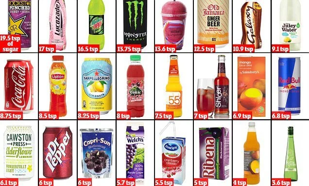 Estimated sugar content in common drinks. Taken from BMA article in DailyMail pub13.7.15